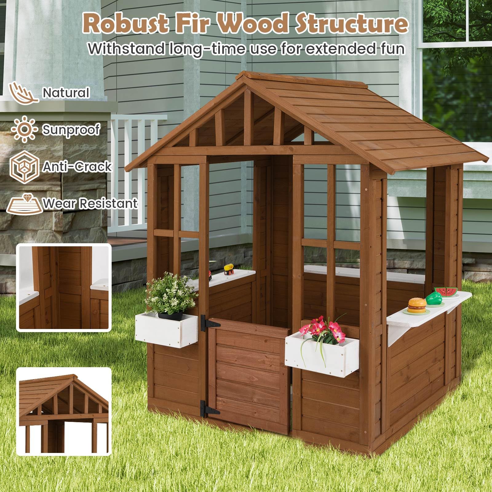 Robust Fir Wood Structure: Built to last, this playhouse is crafted from sturdy, natural fir wood. The sunproof, anti-crack and wear resistant wood structure will withstand long-time use for extended fun.
