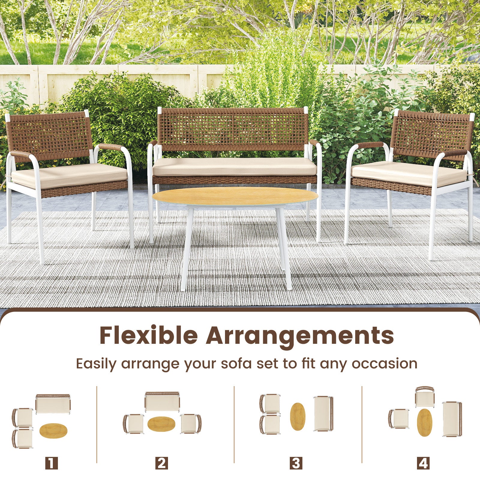 Crafted from refined hand-woven PE wicker that is sun-protective and breathable, the outdoor conversation set ensures lasting durability and timeless appeal. Featuring a heavy-duty metal frame with adjustable foot pads, it provides strong support and superior stability. Enjoy cloud-like comfort with soft, high-resilience sponge cushions, complemented by ergonomic design. The oval tempered glass coffee table boasts a smooth wood-grain surface for a stylish touch and easy cleaning. The flexible layout options allow you to easily arrange your sofa set to fit any occasion, making it well-suited for any balcony, porch, backyard, or garden.