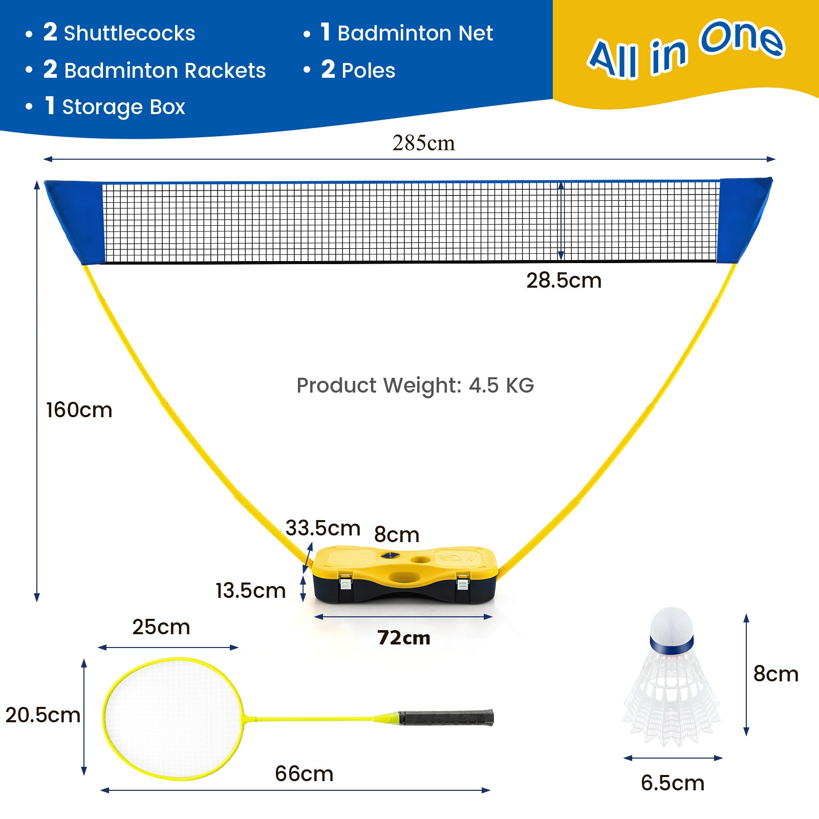 2.85m net, 2 badminton rackets, 2 badminton shuttlecocks, storage box base