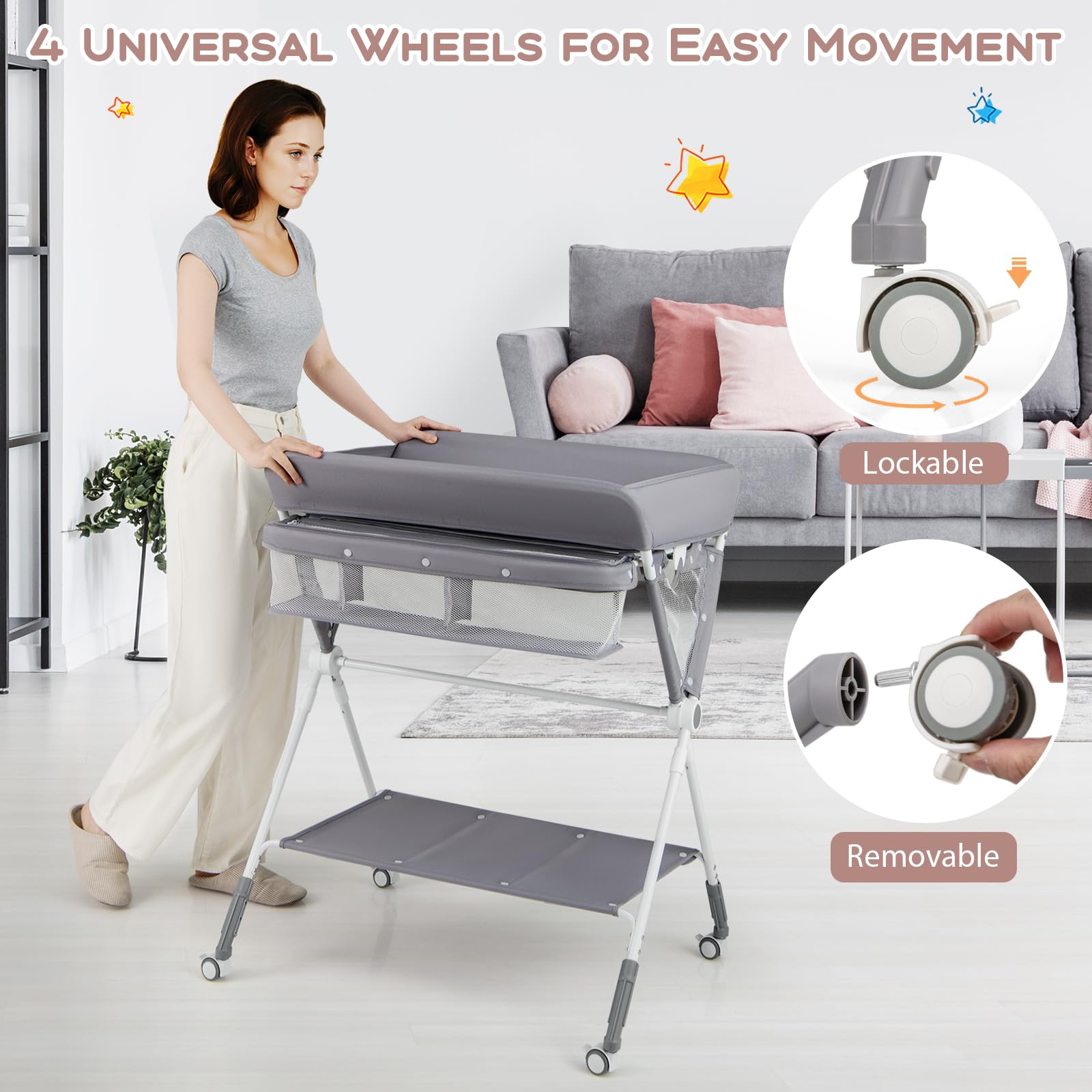 Foldable and Portable Design: This foldable diaper changing station folds quickly in seconds for easy storage and transport: ①press buttons on both sides; ②use the hook to fix the legs. Moreover, 4 lockable universal wheels offer hassle-free movement in the house, and they are detachable according to your need.