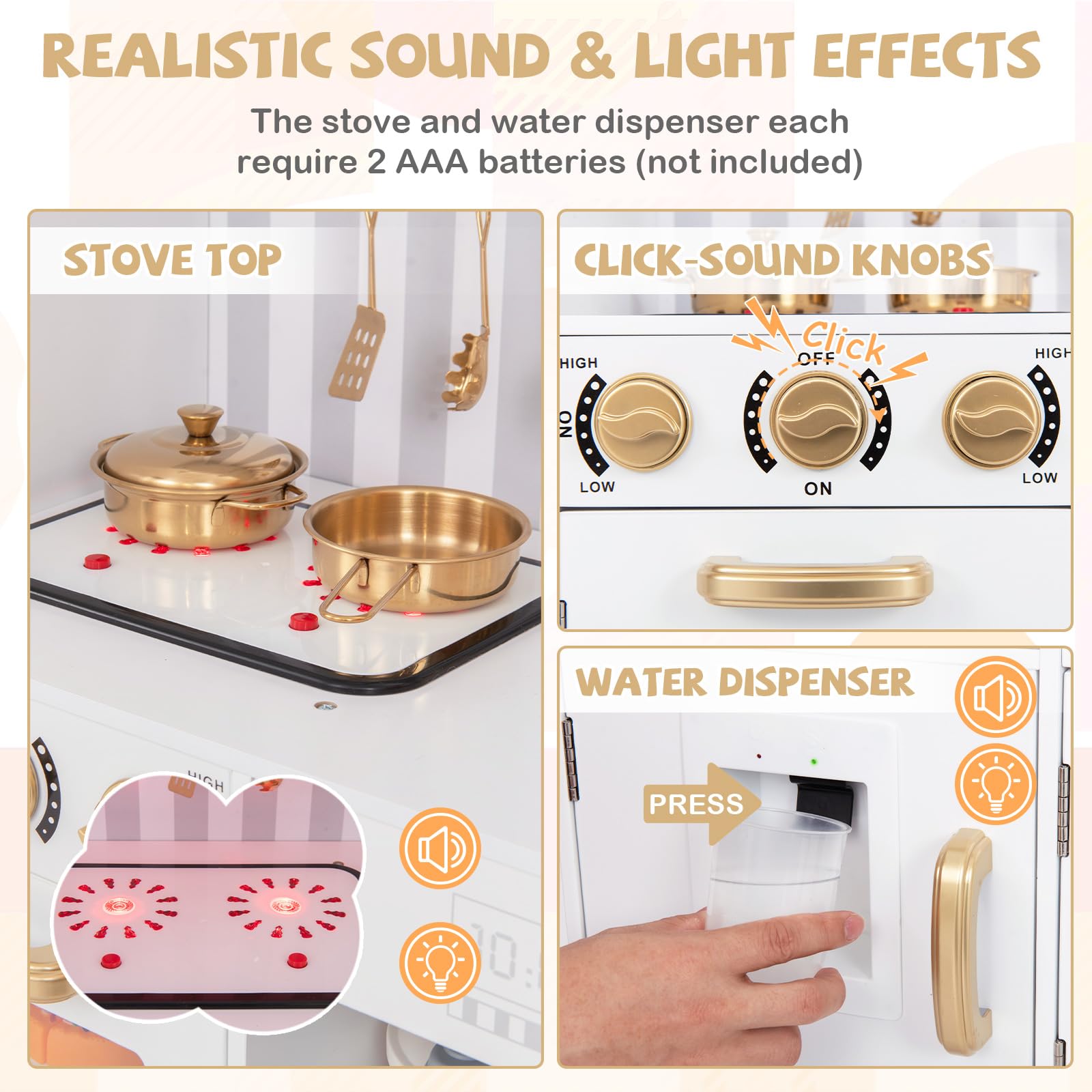 Authentic Sounds and Lights: The stove top comes with buttons that light up and create realistic cooking sounds, while two click-sound knobs add more fun. Moreover, the water dispenser comes to life with light and sound effects. Each component requires 2 AAA batteries (not included).