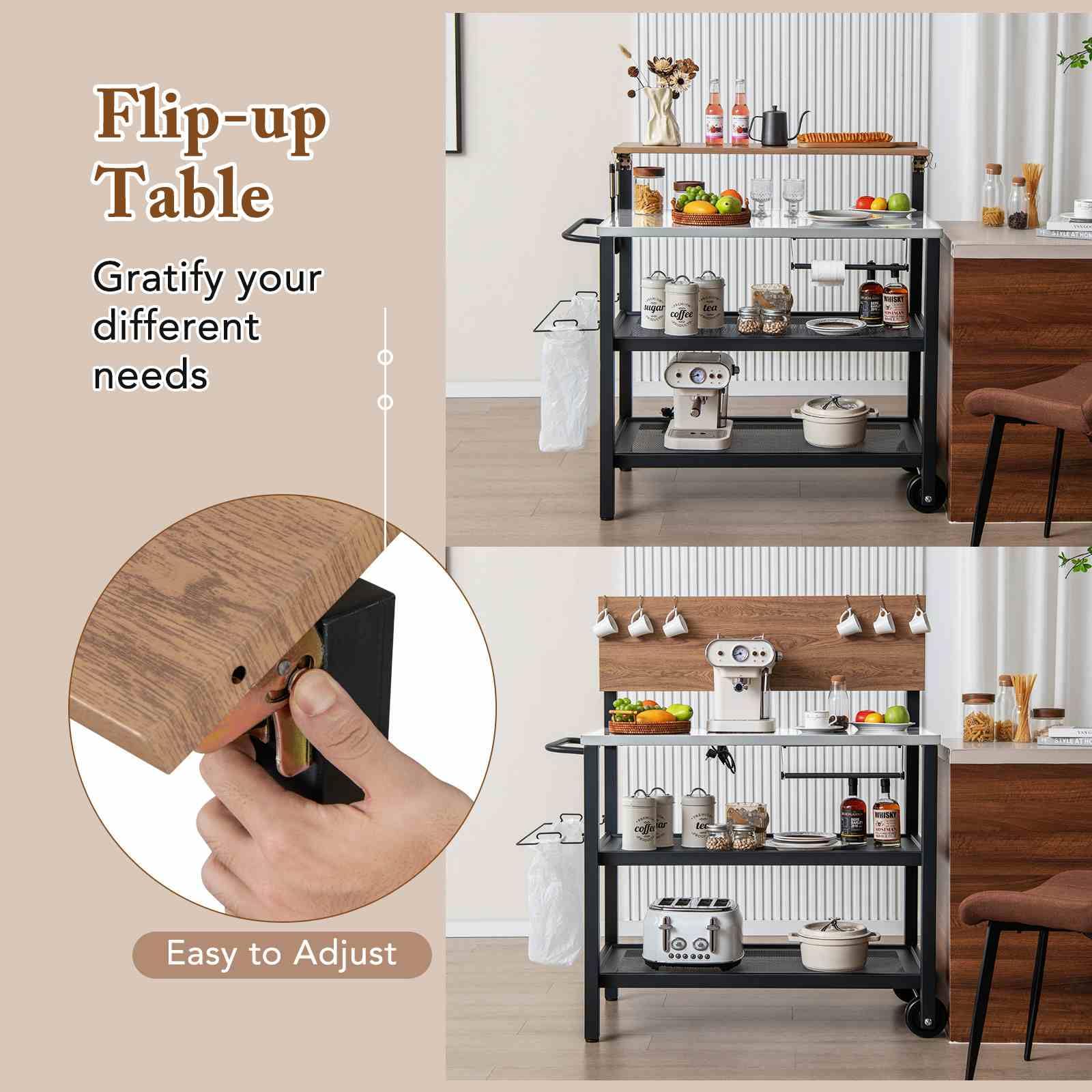 Rolling Bar Cart with Flip-up Table and Foldable Handle for Kitchen
