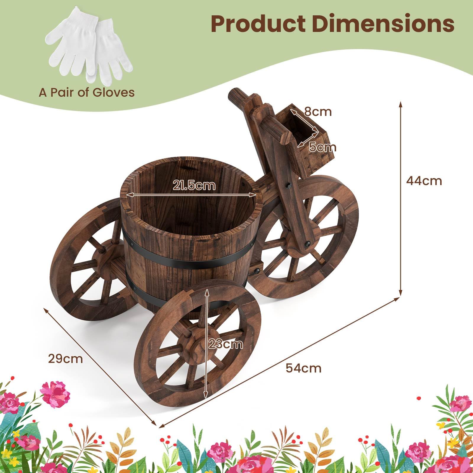 Featuring an inventive 3-wheel tricycle silhouette, the rustic wood planter not only ensures excellent stability but also includes a handy storage box for gardening tools. Expertly crafted from fir wood and fortified by high-temperature carbonation, it offers remarkable strength and resistance to warping, promising long-lasting reliable use. The drainage hole will avoid water accumulation, promoting vigorous root health and optimal airflow for your plants. Boasting a vintage-inspired farmhouse finish and embellished with decorative metal band, this attractive planter brings timeless warmth and visual interest to patios, balconies, gardens, or any space where you desire a nostalgic decorative accent. Plus, the wood cart planter can serves as a potted plants holder or indoor decoration for holiday celebration.