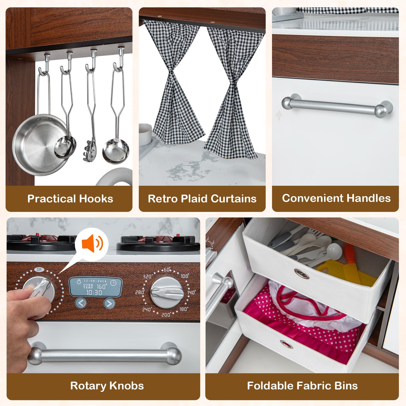 Realistic Light and Sound Effects: This wooden corner play kitchen boasts realistic light and sound effects on the range hood and stoves. Thus, children are able to enjoy excitement while preparing their imaginary culinary masterpieces with a touch of authenticity.