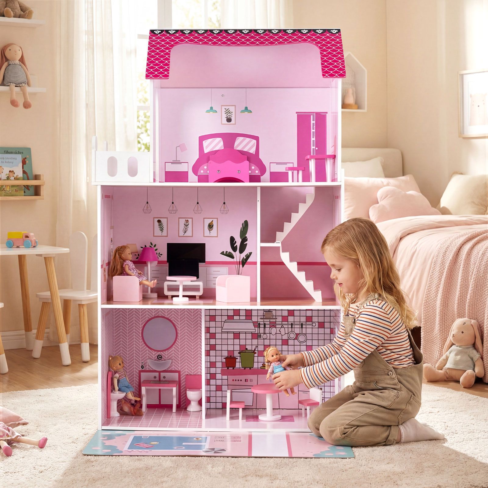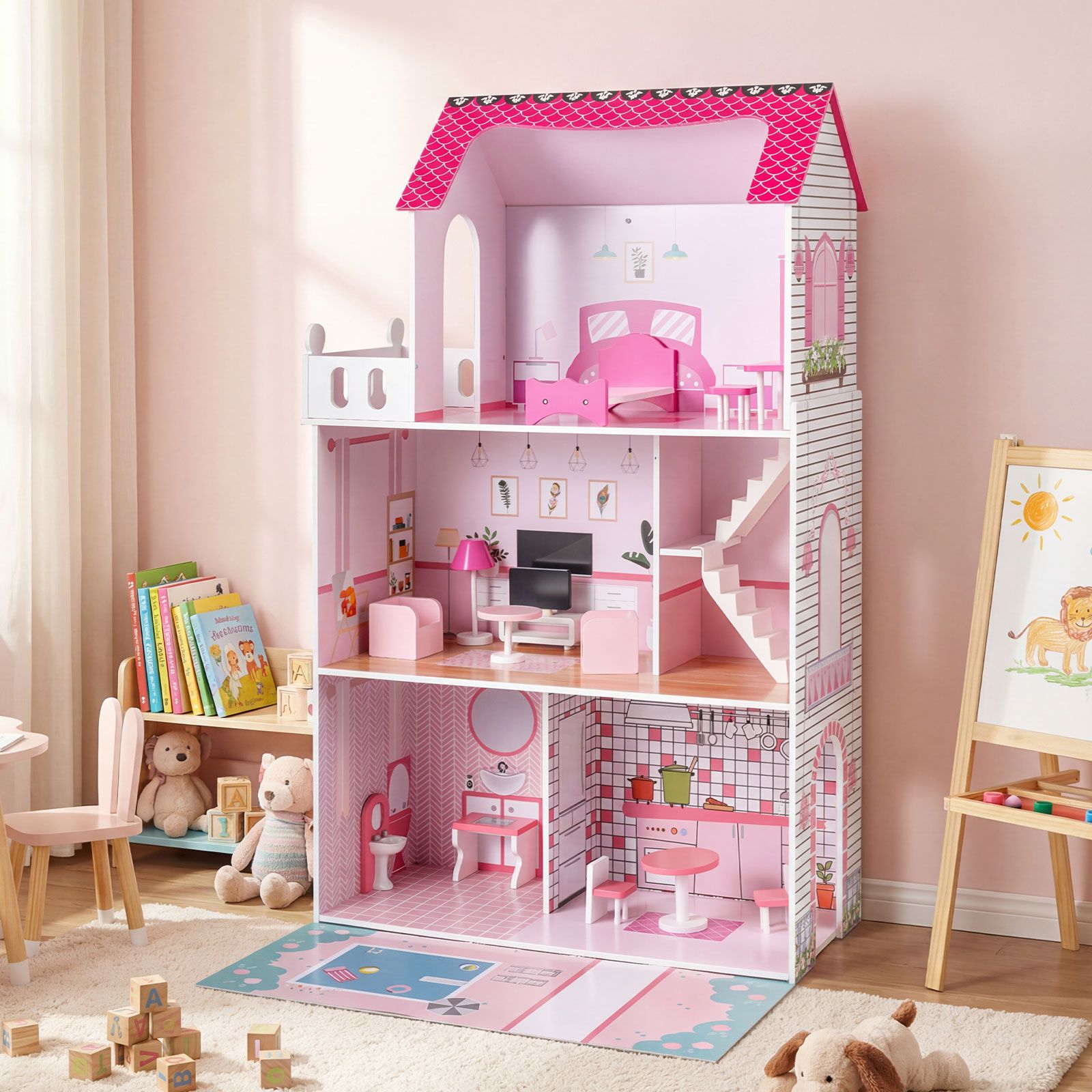 With 15 charming furniture pieces, 2 staircases, and a backyard pool scene, kids can rearrange, design, and dream up new stories every day. Crafted from child-safe material with smooth, rounded edges and a secure anti-tip kit, this pretend play dollhouse is built for safe, worry-free fun. Every room dazzles with vibrant wallpaper and intricate details that spark imagination and creative role-play. Delight your child (and their friends) with hours of educational fun, fostering communication, social skills, creativity and imagination in one enchanting playhouse!