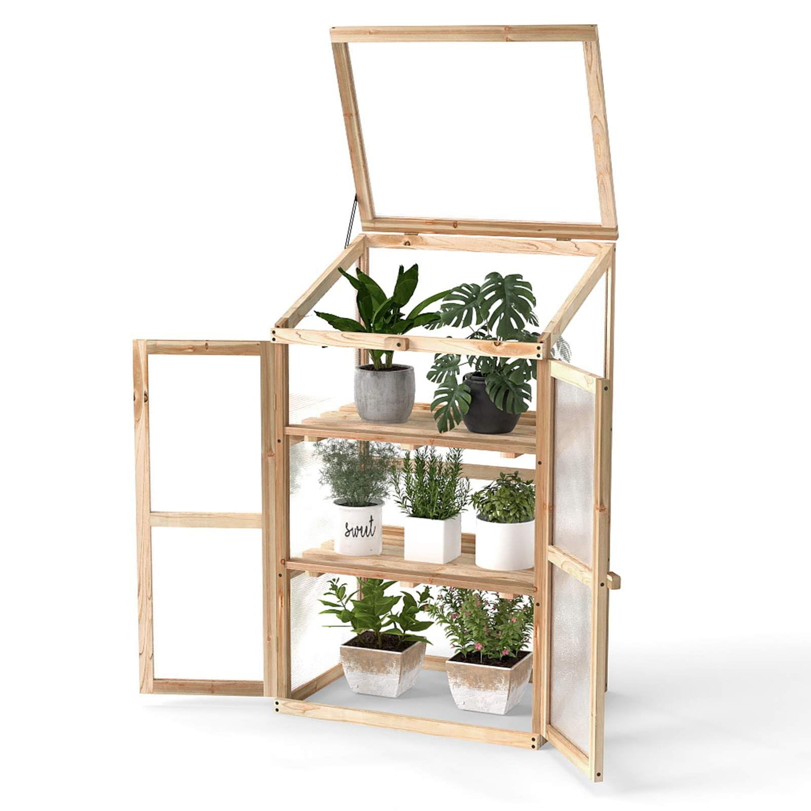 Made of premium fir wood and transparent polycarbonate glazing boards, this portable wooden greenhouse can bear the weight of a great amount of plants and help preserve the heat inside. Besides, the upper foldable top and 2 doors make it convenient for you to move your plants as well as ensure the air circulation in the greenhouse and avoid the accidental frost, storm and exposure. You will also get a wonderful visual experience for its plain and natural design!