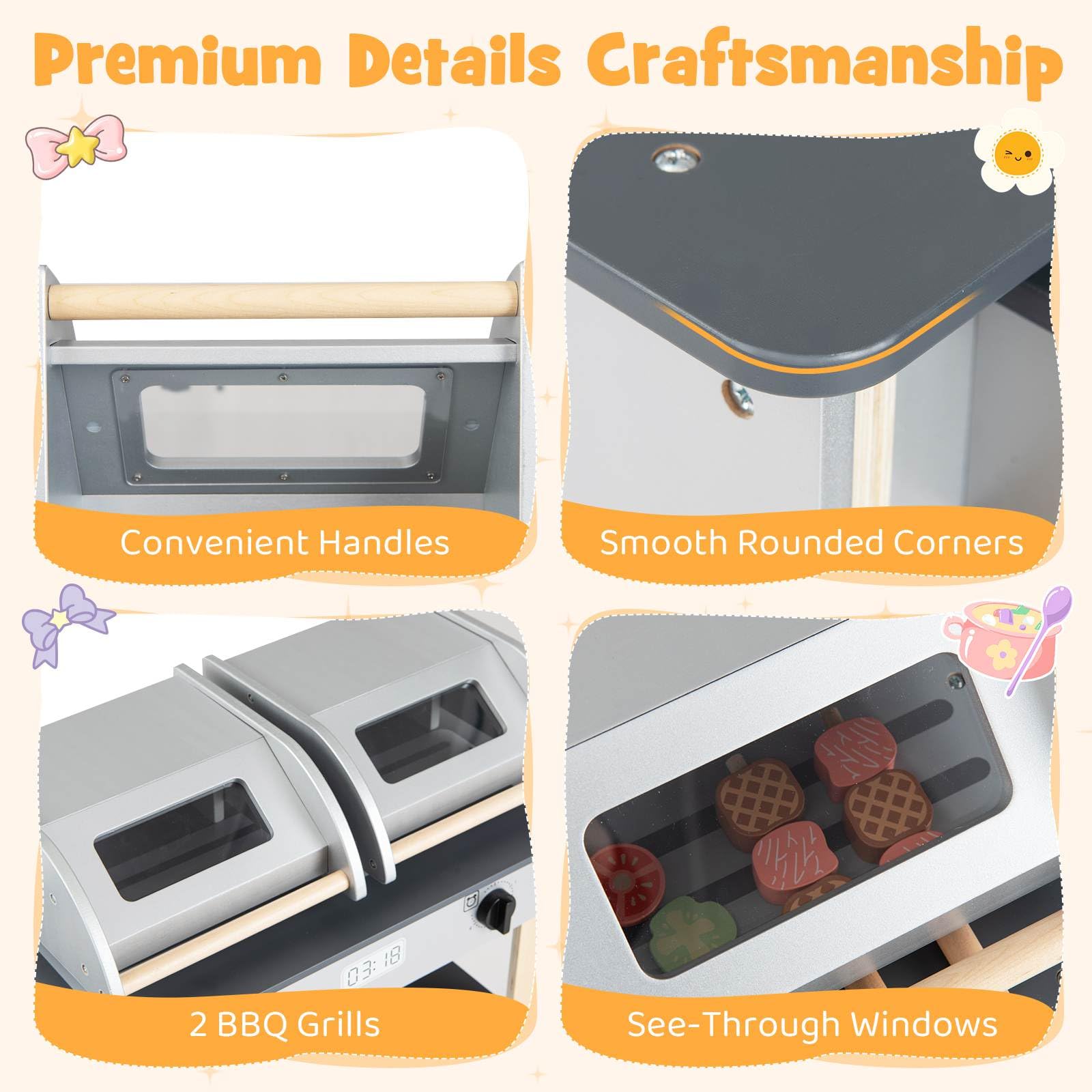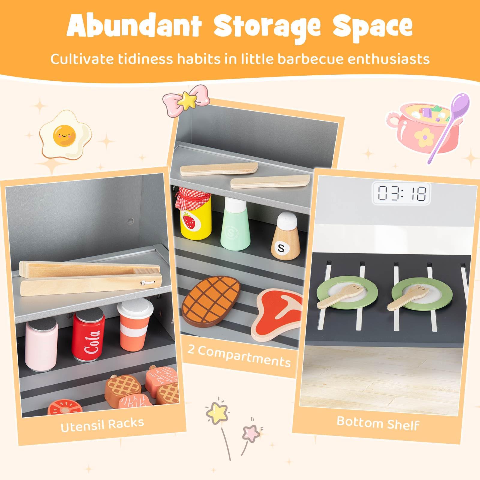 Abundant Storage Space: With the kids play kitchen, tidying skills bloom alongside culinary creativity. This playset boasts utensil racks, compartments and a spacious bottom shelf, encouraging young chefs to keep their grilling space neatly organized, cultivating habits of cleanliness and order that extend beyond the play area.