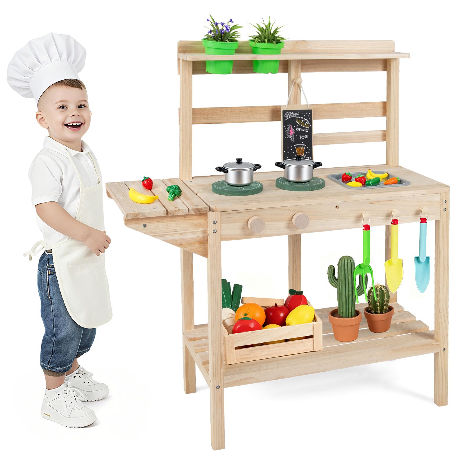 The outdoor play kitchen set offers interactive cooking experiences. Your little one can rotate the knobs, cook on the stoves and write on the chalkboard. A versatile sink supports multiple activities such as washing vegetables and fruits, mud playing, and outdoor sand games, enhancing hands-on learning opportunities. Decorative flowerpots add a playful gardening touch, while hanging hooks and spacious storage shelves provide convenient organization for accessories. Built to last, the kitchen playset is well-crafted with sturdy wooden construction. All in all, this toy kitchen playset encourages imaginative outdoor play and social interaction.