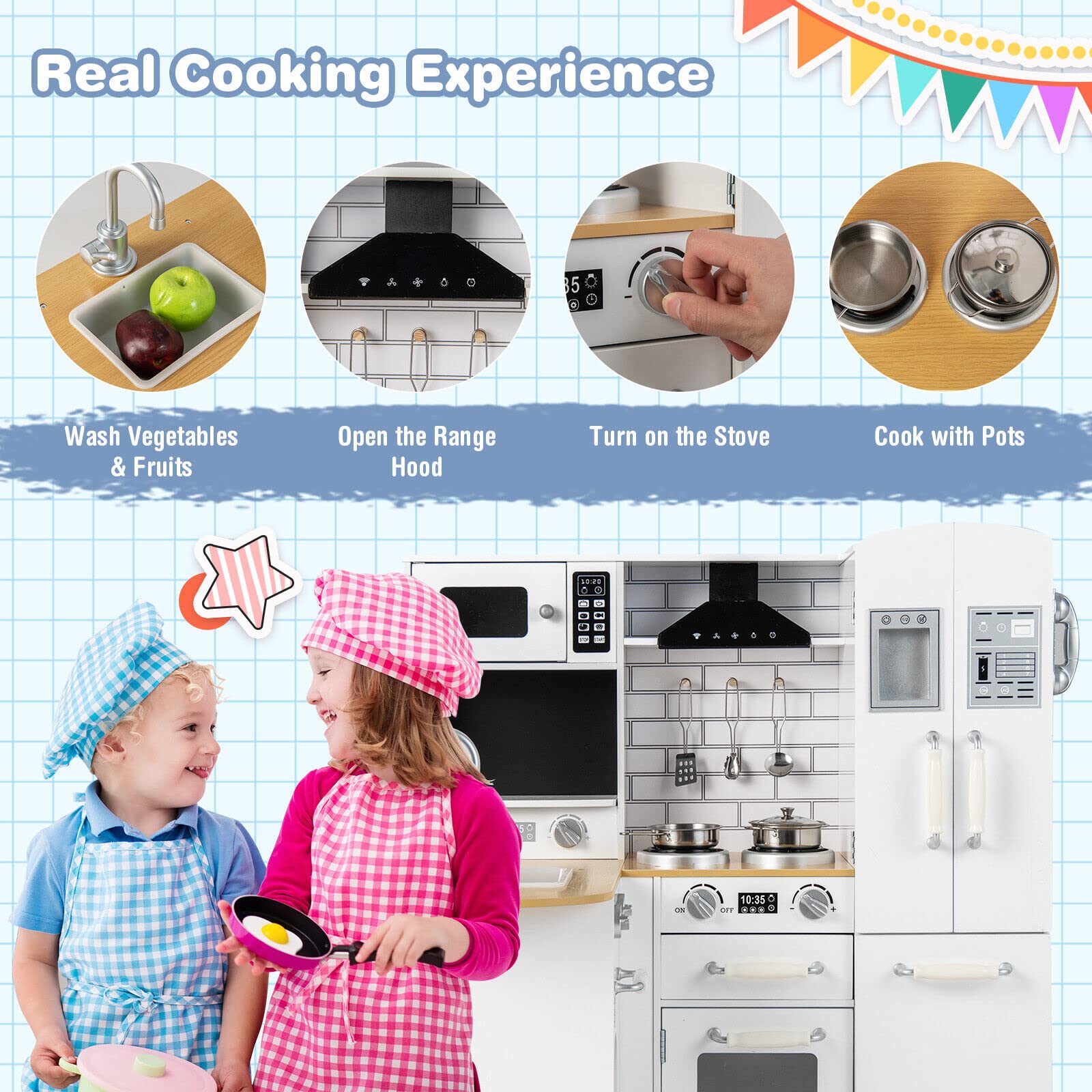 Realistic Cooking Experience: This wooden kitchen playset features 1 sink with faucet, 1 stove and 1 range hood to offer kids an interesting cooking experience. Toddlers can pretend to wash vegetables and vegetables, open the range hood, turn on the stove and cook with pots like a real chef.